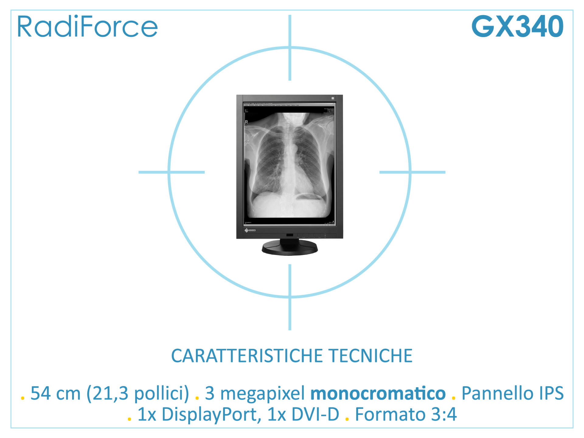 Il monitor a 3 megapixel GX340 con una tabella colore a 14 bit è in grado di riprodurre con accuratezza le strutture anatomiche del cranio, del torace e delle estremità.