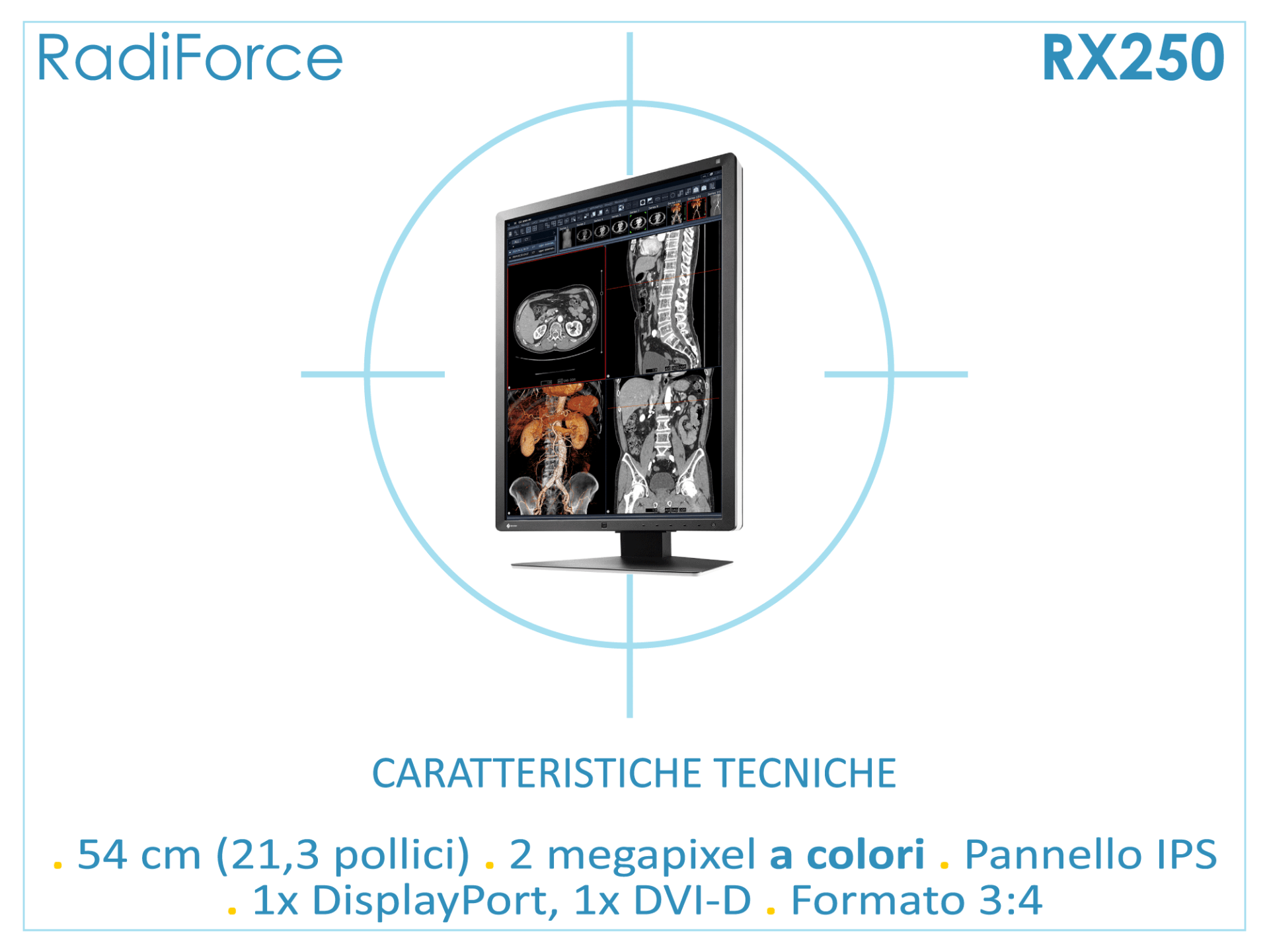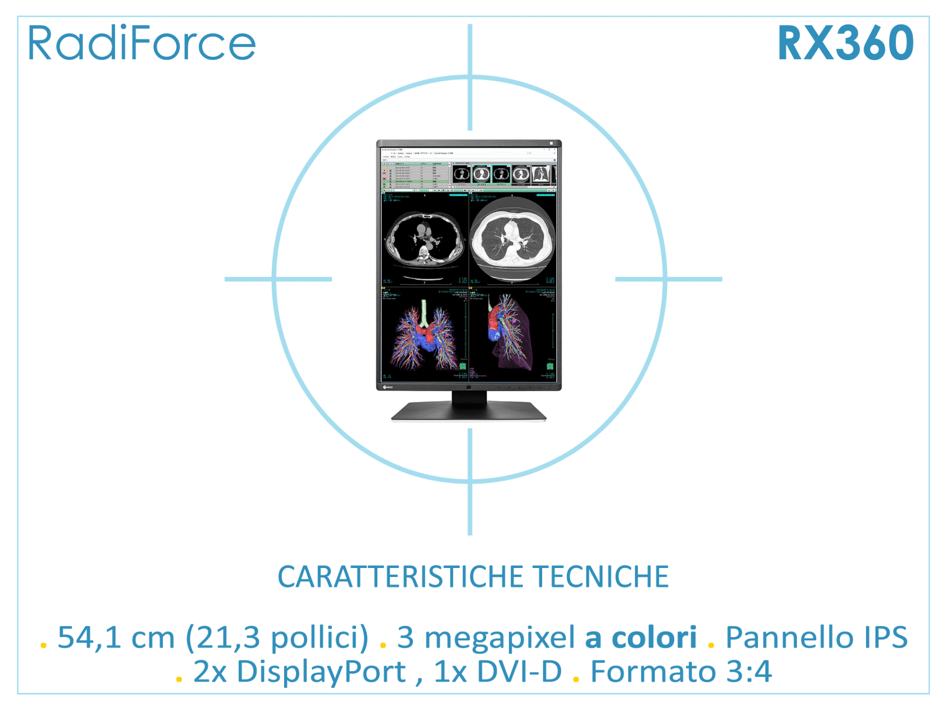 Il modello RX360 a 3 MP e curva DICOM-GSDF si presta perfettamente per la riproduzione di immagini medicali a colori e in scala di grigio di sistemi di acquisizione radiologici.