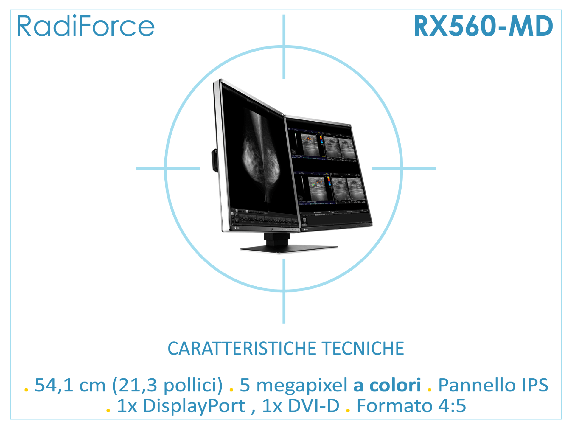 La tecnologia Hybrid Gamma PXL del monitor RX560 MammoDuo identifica su unico schermo e con la massima precisione le aree di visualizzazione in scala di grigio e quelle a colori, impostando la luminosità in maniera opportuna e restituendo simultaneamente immagini estremamente chiare
